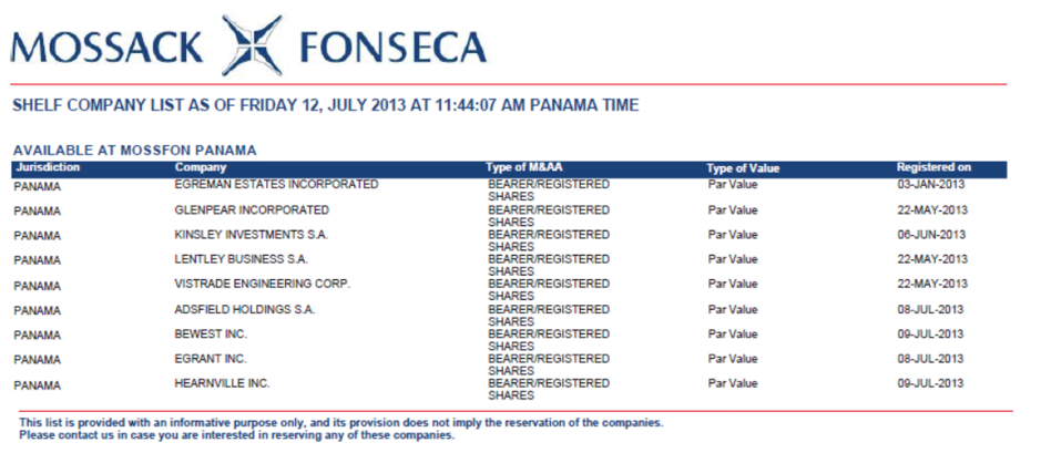 On 12 July 2013, MossFon’s menu of available shelf companies was: