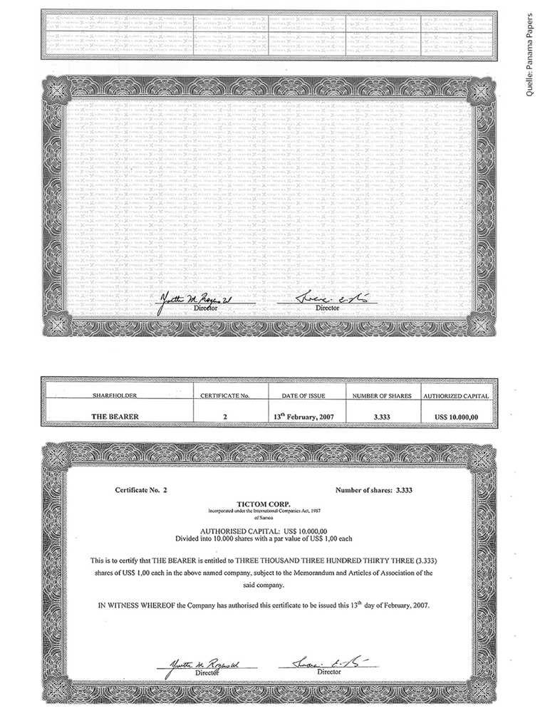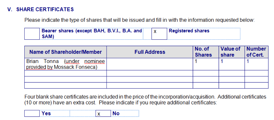 In order to make clients’ lives easier, MossFon also included four blank but signed share certificates in the price (and more for a fee) so that the buyer could print out new share certificates as the anonymous company bounced around from owner to owner.
