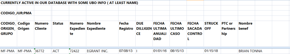 In a follow up email that same day, Cesar attached an updated spreadsheet. This time, Egrant, along with a handful of other companies (around 1.5%) had been moved to the list of companies with some UBO info (at least a name):