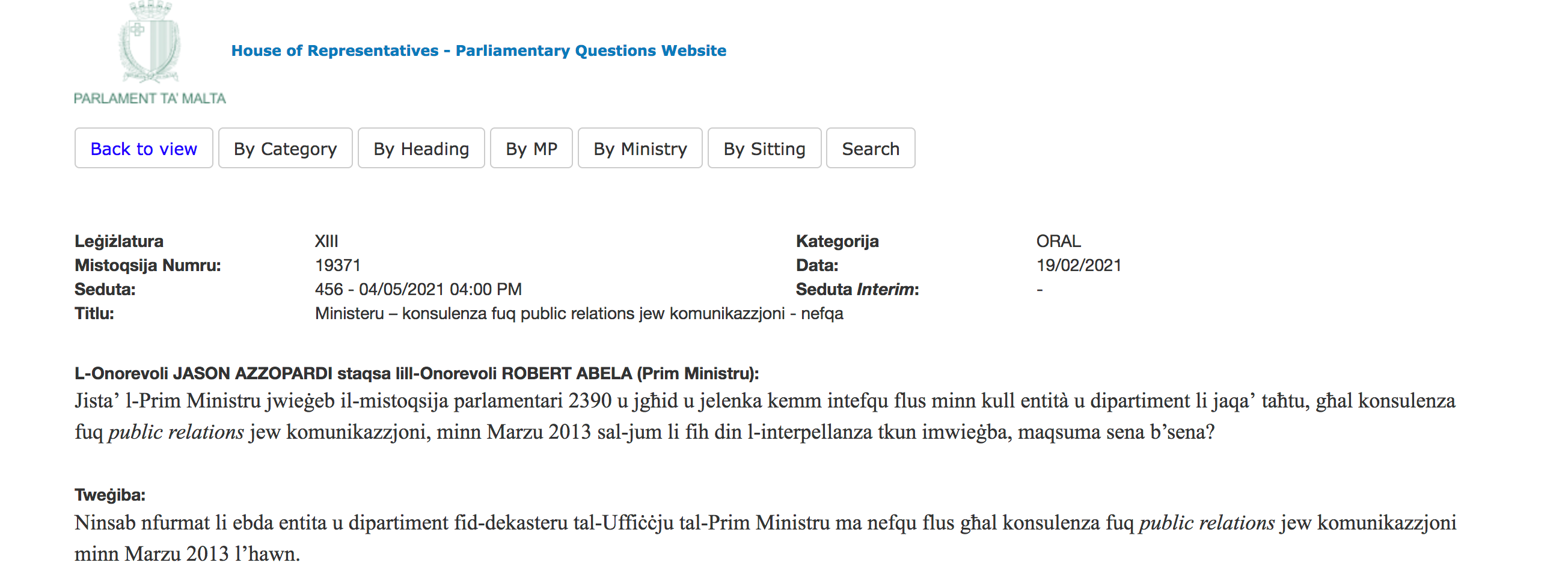 We, in our ignorance (let’s let Bedingfield have a thrill, shall we?) thought that while this was the truth and, in a certain light, nothing but the truth, it was certainly not the whole truth because the PQ asked for information on the situation since 2013, not only that of the Abela Era.