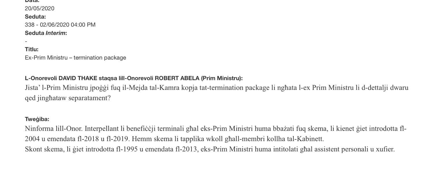 Yet Muscat is contradicted by a response from Robert Abela to a parliamentary question by Opposition MP David Thake in June 2020 in which the current prime minister states: