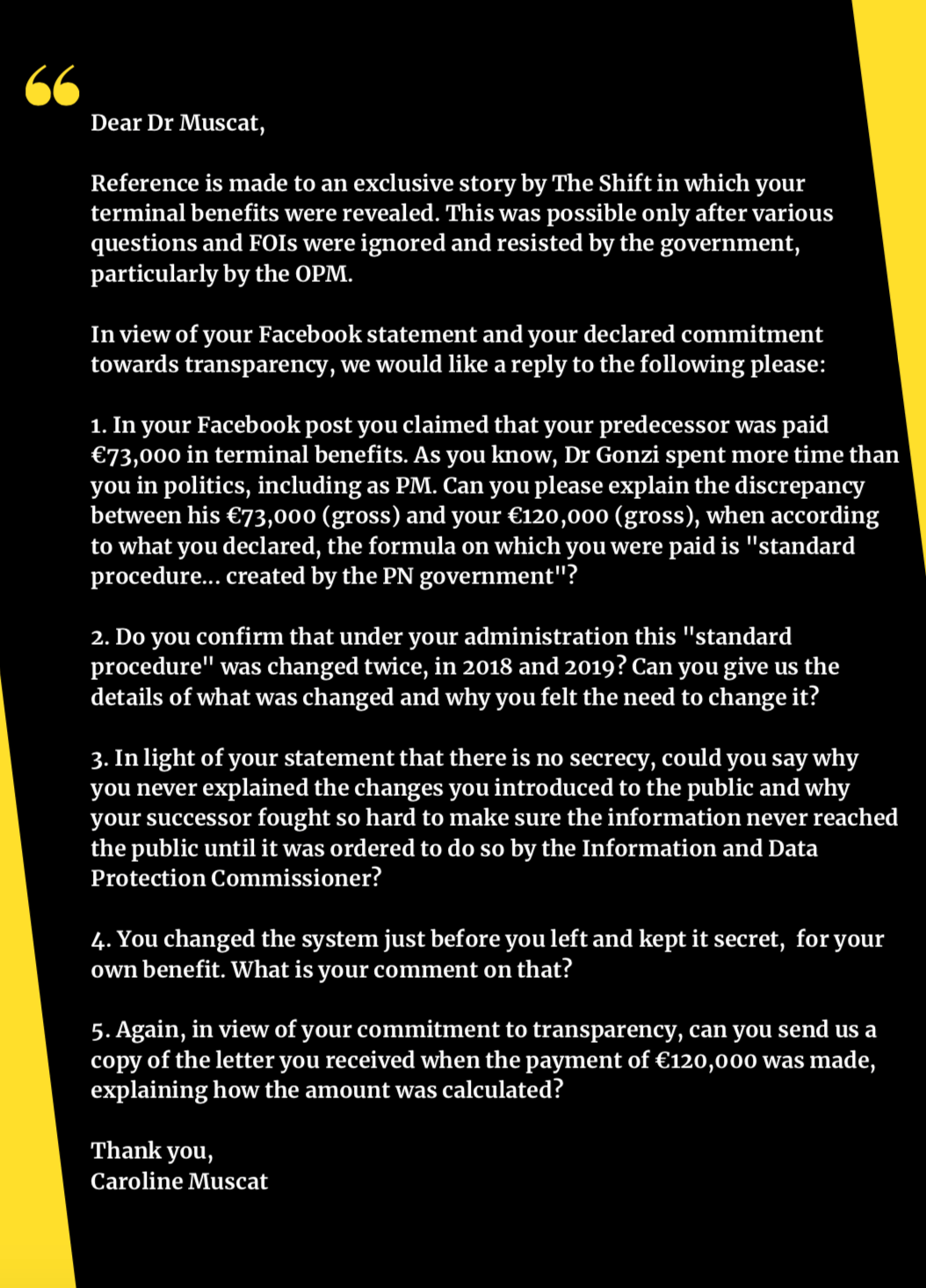 The Shift asked Muscat to explain the discrepancy – why he got double what he was entitled to and how he had changed the formula – but despite his denials of secrecy and his commitment to transparency, no answers were received.