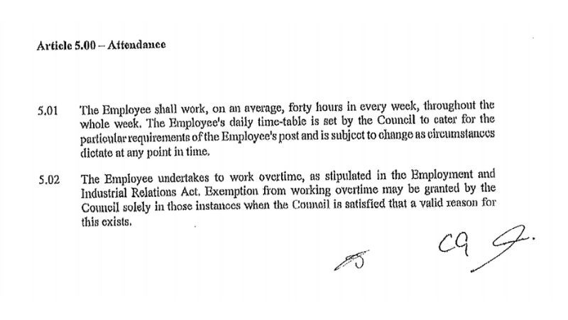 The contract states that Gouder is supposed to work 40 hours a week, as any other full time employee. However, it adds that “the employee’s daily timetable is set by the Council to cater for the particular requirements of the employee’s post and is subject to change as circumstances dictate at any point in time”.