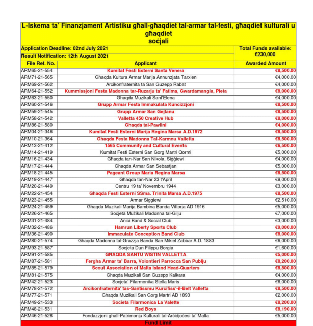 The Arts Council also allocated the highest amount of funds possible to those groups based in Herrera’s district, who were granted €8,000 or more each, while those from other parts of Malta were awarded smaller sums.