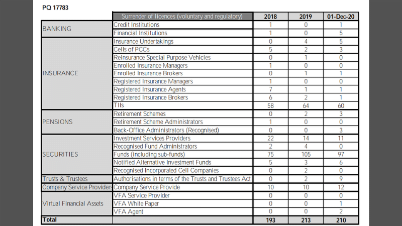 A parliamentary question filed by Opposition MP Ryan Callus in January revealed that between 2018 – 2020 alone, as many as 616 companies relinquished various types of licences from the MFSA.
