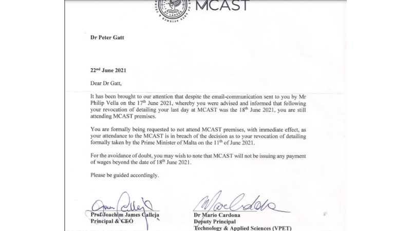In the letter, seen by The Shift, dated June 22, MCAST’s head told Gatt that he was barred from entering the MCAST campus – where he is a senior lecturer – as he was no longer considered to be a member of the staff.