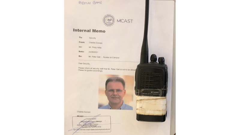In another measure ordered by Calleja – a former personal assistant of a PN Parliamentary Secretary– a notice displaying a picture of Gatt was affixed to the main entrance of the college, asking all security guards to bar Gatt from the premises.