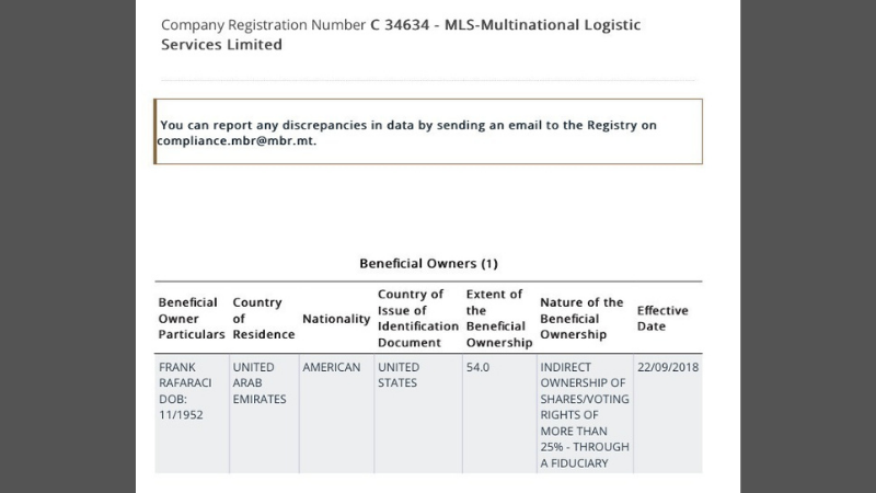 Frank Rafaraci, who allegedly defrauded the US Navy of around $50 million and yet walked out of a Maltese courtroom twice due to a series of legal technicalities, owns a company registered in Malta called Turner Holdings Ltd and is also CEO and listed beneficial owner of another, Multinational Logistic Services Ltd (MLS) – the company cited in the alleged crime, The Shift has learned.