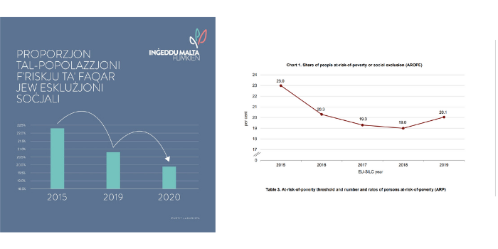 Publicly available information on the percentage of the population that is at risk of poverty was published by the National Statistics Office in December last year and it tells a different story. In its publication, the NSO charts how in 2019, the at-risk-of-poverty or social exclusion rate was estimated at 20.1% of the population living in private households in Malta. The 2019 rate increased by 1.1 percentage points when compared to 2018.
