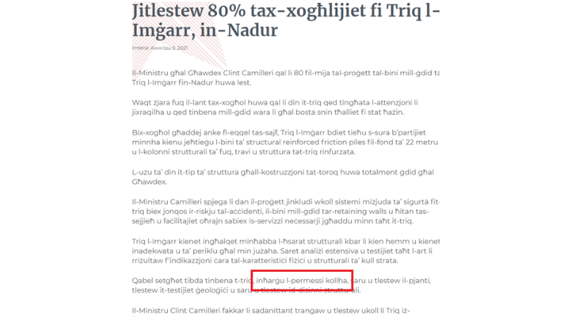 Investigations by this portal reveal that the Ministry for Gozo, which is responsible for the road works, didn’t even apply for a permit, not even through a minor Development Notification Order (DNO).