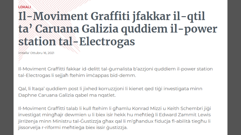 Referring to an action in which local NGO Moviment Graffitti commemorated Caruana Galizia’s assassination by dropping a banner in front of the Electrogas power station bearing the words ‘an agreement soaked in blood’, TVM’s coverage spans just three paragraphs, omitting all references to Graffitti’s efforts to highlight how corruption involving the state and big business remains rampant.