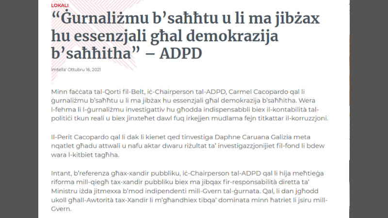 Referring specifically to PBS and the news reports exposing TVM’s attempts at controlling the topics chosen for current affairs programs, ADPD’s deputy general secretary, Sandra Gauci, described the state broadcaster as “an extension of the government’s propaganda machine”. TVM’s article completely omits Gauci’s points, choosing instead to cite only the later statements made by ADPD chairperson Carmel Cacopardo.