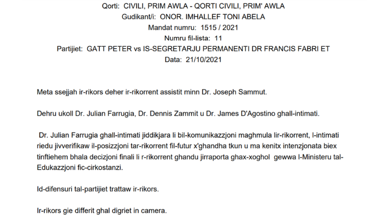 Defending the Ministry from accusations of a contempt of a court order, the Ministry’s lawyer insisted that the authorities had no intention of forcing the transfer of Gatt, as being pushed by MCAST’s Principal James Calleja.