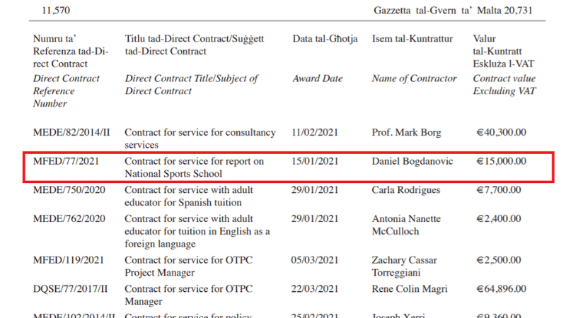 The most recent list of direct orders made by Education Minister Justyne Caruana in the last six months shows that Caruana’s ‘boyfriend’, Xewkija Tigers player-coach Daniel Bogdanovic, was paid in full for the controversial €15,000, three-month contract he’d been awarded to conduct a study on the national sports curriculum, despite the prime minister’s intervention to terminate the deal.