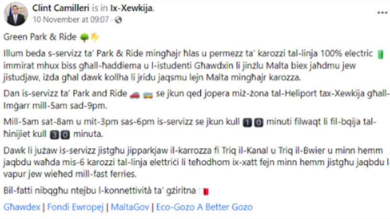 Now, ignoring the fact that no progress has been made on the construction of the facility that should have been the location for the park and ride scheme, a wide road next to the heliport was turned into a parking lot so the six electric buses started ferrying commuters to the Mgarr Harbour.