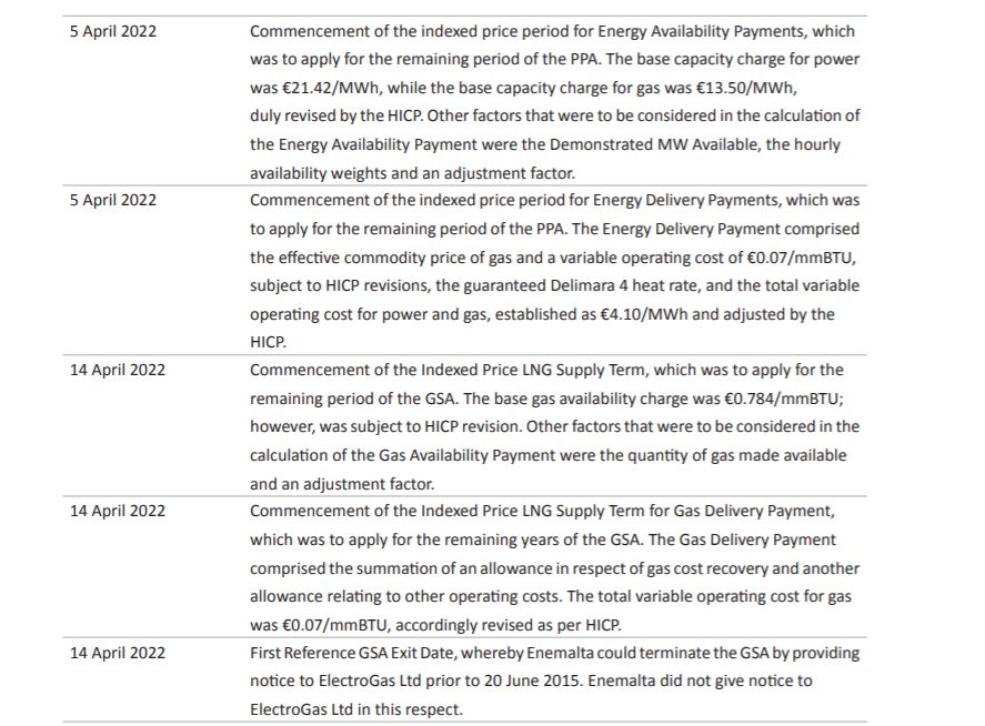 These revisions include the ‘Energy Availability’ and ‘Energy Delivery’ payments charged to Enemalta and, most importantly, the supply of LNG to Enemalta through the Power Purchase Agreement and the Gas Supply Agreement.