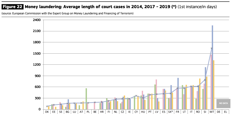 According to the data gathered for the years between 2017 and 2019, Malta continues to rank last among the 27 EU countries, with an average of 1644 days to conclude a money laundering case, followed by Slovenia (789 days) and Romania (620 days).