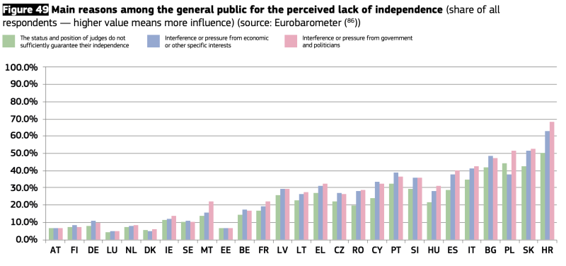 Among those who responded that they perceive a lack of judicial independence in Malta, 22% quoted interference from government and politicians as the main reason for their answer. This type of interference was the most cited reason across the 27 member states.