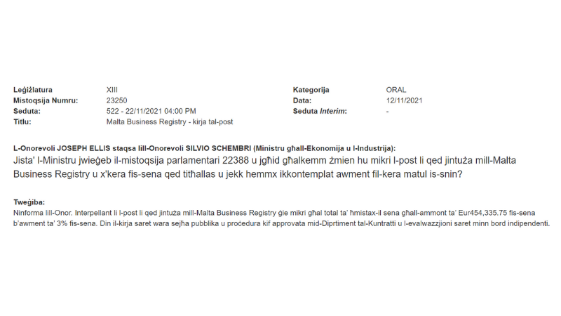Schembri has refused to publish the contract, requested by PN MP Joe Ellis, citing “commercial sensitivity”.