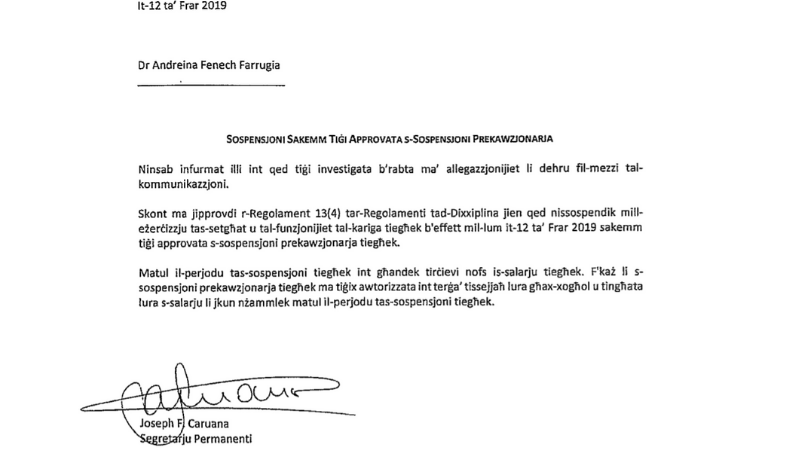 A copy of her suspension letter issued by then-Permanent Secretary Joseph Caruana in February 2019, obtained by The Shift, informed Fenech Farrugia about her immediate suspension as a “precautionary measure” according to the internal disciplinary rules guiding the public service.