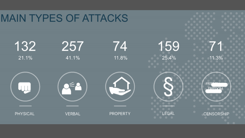 Some 26.5% (166 alerts) of the reported incidents were attacks against journalists, media workers, media companies and their family members.