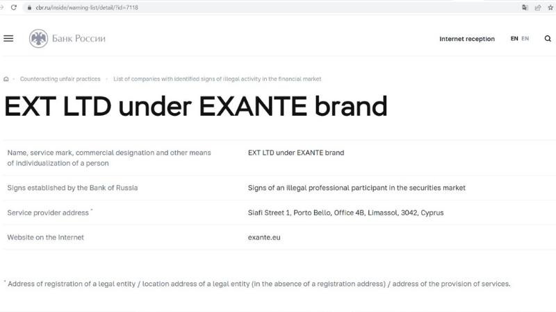 As previously reported, one company in the network of companies making up the Exante brand was blacklisted by Russia’s Central Bank over “signs of illegal professional participation in the securities market” last year and is no longer authorised to operate in Russia.
