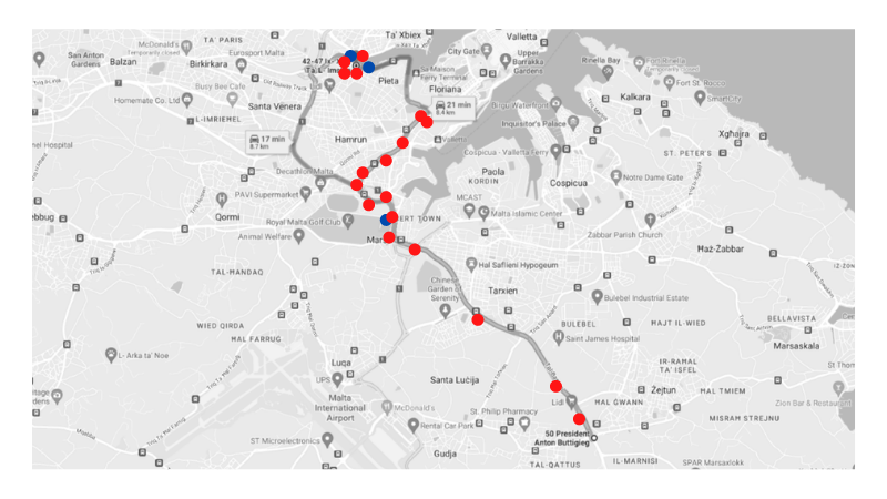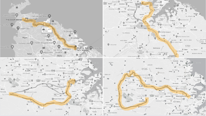 The route which proved to be most packed with political advertising was a route starting from Tal-Barrani road, going through Marsa and finishing at Msida. In just 8.4km of roads in a historically PL district, The Shift logged 26 ads from the PL and just four ads from the PN.