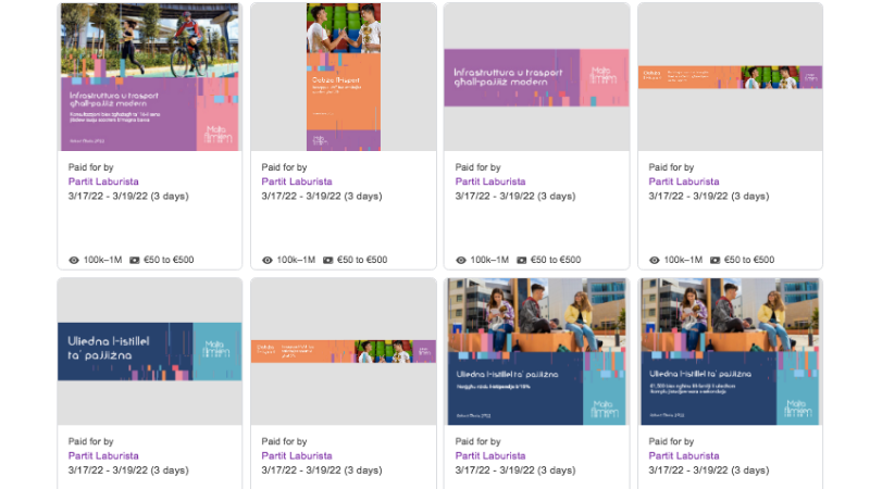 An exercise carried out by The Shift analysing the report, which details and displays each and every advert purchased by the political party, found that Labour purchased over 450 different advertisements throughout the campaign, while the Nationalist Party purchased some 250. The format of advertisements for both parties include videos, banners of different sizes, and gifs.