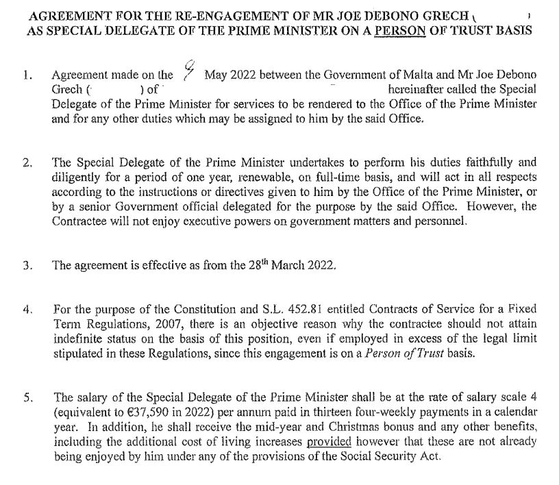 The role given to Debono Grech is non-existent. The contract, obtained following a Freedom of Information request, shows that while he is employed on a full time basis, he has no office space and no duties at Castille.