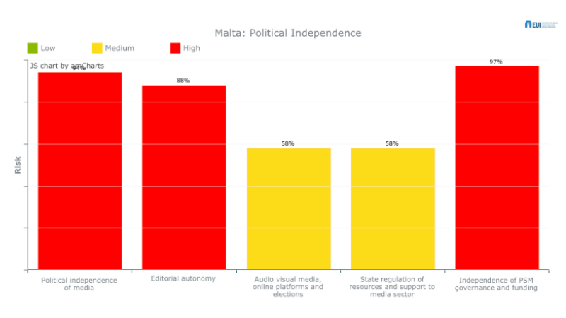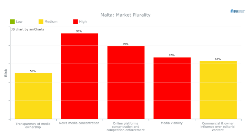 The absence of transparent data pertaining to market shares of media companies, advertising revenue, as well as lack of information on print media circulation figures and online activity were listed as the main contributors to Malta’s ‘high risk’ score on market plurality.