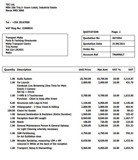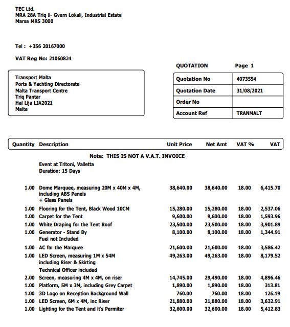 Ngħidu aħna, għal tinda ‘marquee’, Charles Magro tat-TEC, lil Transport Malta żammilha xejn inqas mis-somma fenomenali ta’ €40,000, u magħhom żied spejjeż oħra għat-tiżjin: €50,000 biex jikri screens LED; €15,000 għall-kisi tal-art bl-injam; €24,000 għad-drapp; €22,000 għas-sistema tal-air condition (minkejja li l-event saret f’Ottubru); u €33,000 biex idawwal madwar it-tinda.