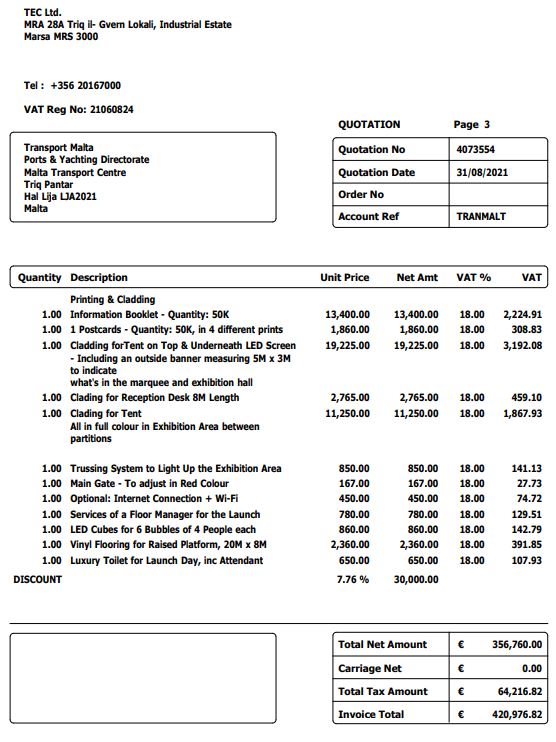 Transport Malta kisret ir-regoli tal-procurement b’mod sfaċċat, għax il-kont li bagħtet it-TEC qasmitu f’20 direct order differenti. Dan wassal għas-suspett li l-ħaġa saret apposta biex tevita li jkollha tispjega għax ma ħarġitx tender qabel ma sar l-event, prassi standard u obbligatorja tar-regoli tal-procurement.