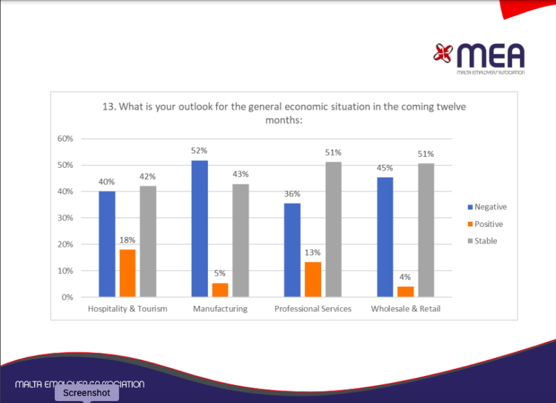 The survey respondents’ overall outlook for the coming months is negative to stable with manufacturing, with companies catering for the domestic market having a more negative outlook than those in the hospitality and tourism or professional services sectors.