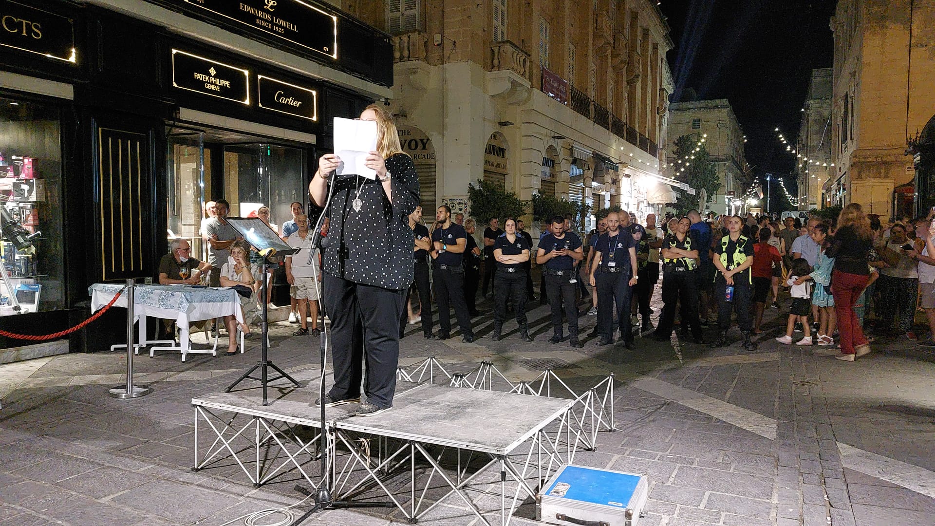 Police lined up behind the main speakers, stopping protesters from reaching the memorial for Daphne Caruana Galizia in front of the law courts due to a government event.