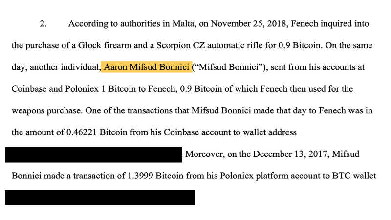 “According to authorities in Malta, on 25 November 2018, Fenech inquired into the purchase of a Glock firearm and a Scorpion CZ automatic rifle for 0.9 Bitcoin. On the same day, another individual, Aron Mifsud Bonnici sent from his accounts at Coinbase and Poloniex 1 Bitcoin to Fenech, 0.9 Bitcoin of which Fenech then used for the weapons purchase,” the document submitted in court by the US authorities states, which goes on to detail further transactions listed.