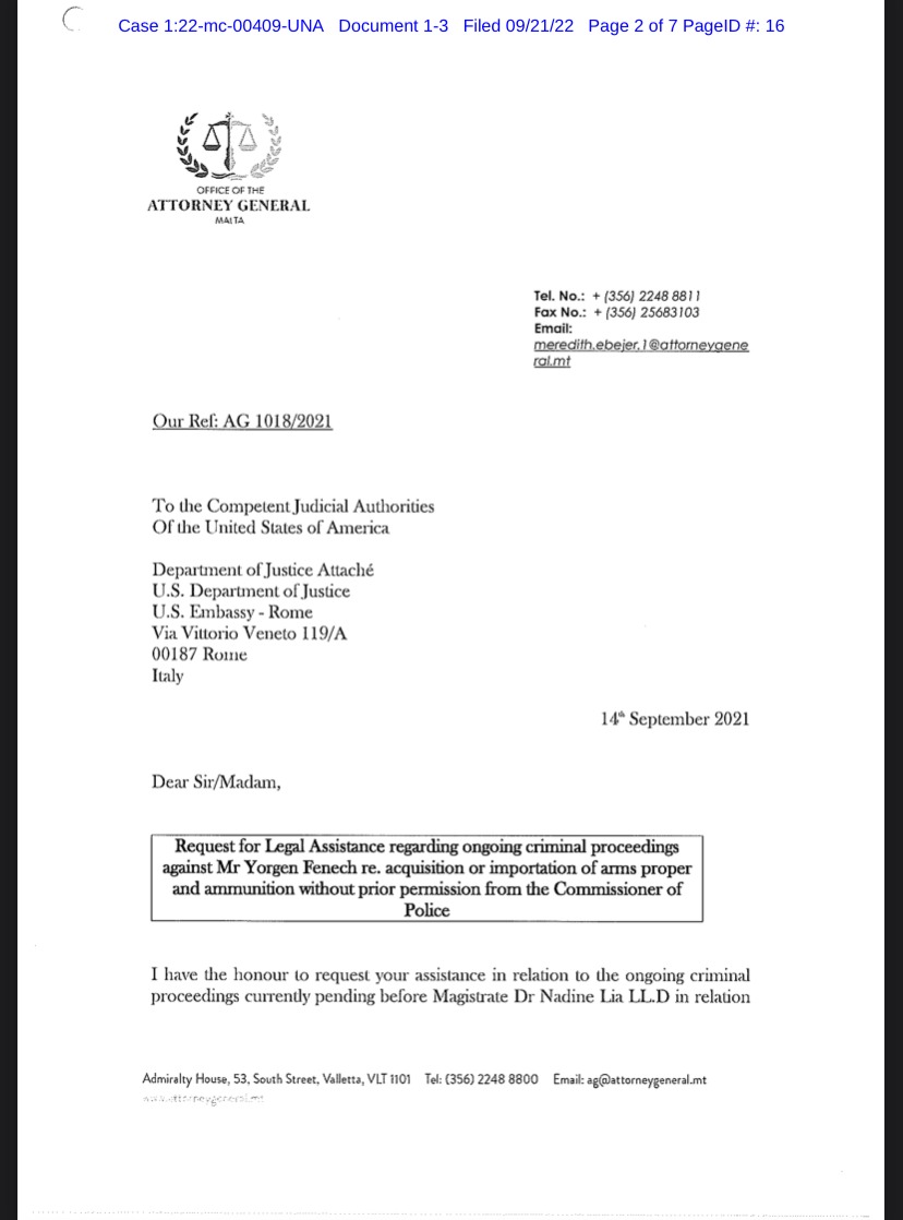 Malta sent a rogatory letter on 14 September asking for information in relation to Fenech’s “unlawful acquisition of firearms on or about 13 December 2017 and 25 November 2018.”