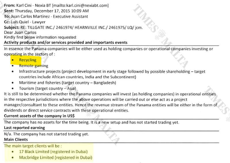 A December 2015 email leaked in the Panama Papers showed Schembri, as well as former minister Konrad Mizzi, had intended to use his Panama company as a holding or operational company investing or operating in the area of recycling, among other areas of operation.
