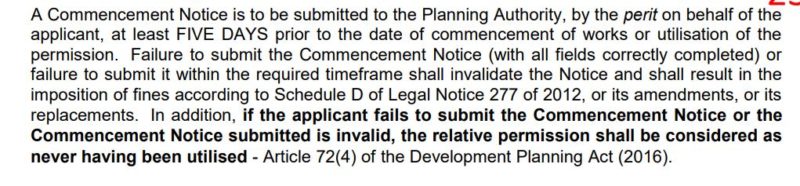 According to a fast-tracked permit, known as a Development Notification Order (DNO) issued last June, the construction project could only proceed if the architect involved, Adriana Zammit, had first filed a Commencement Notice with the Planning Authority and obtained the necessary clearance from the Building and Construction Agency (BCA).