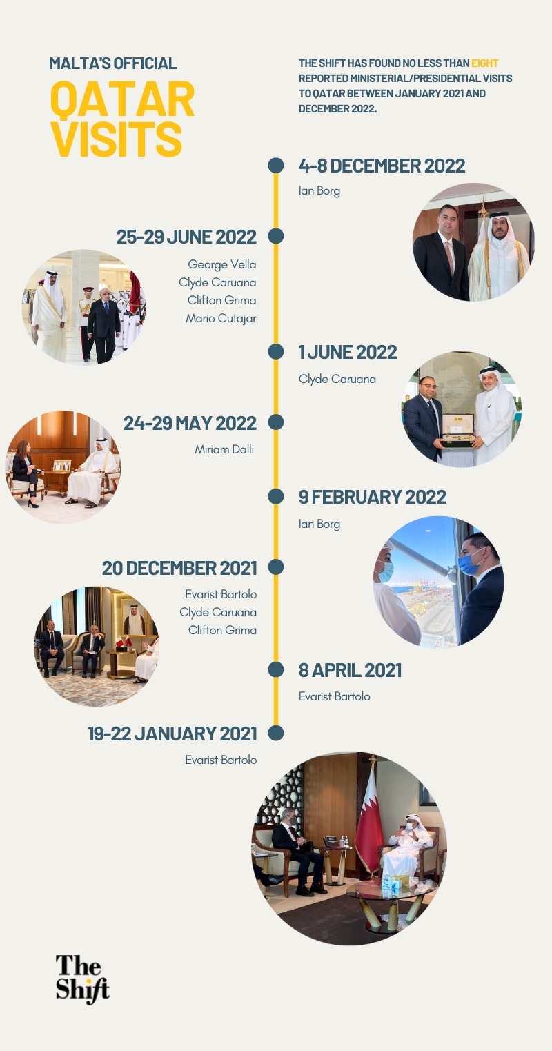 Bejn Jannar tal-2021 u Diċembru 2022, ministri u uffiċjali għolja Maltin, il-Qatar żaruh mill-inqas tmin darbiet, u l-Ministru tal-Finanzi, lil dan il-pajjiż tal-Golf żaru tliet darbiet, darbtejn minnhom f’Ġunju biss.
