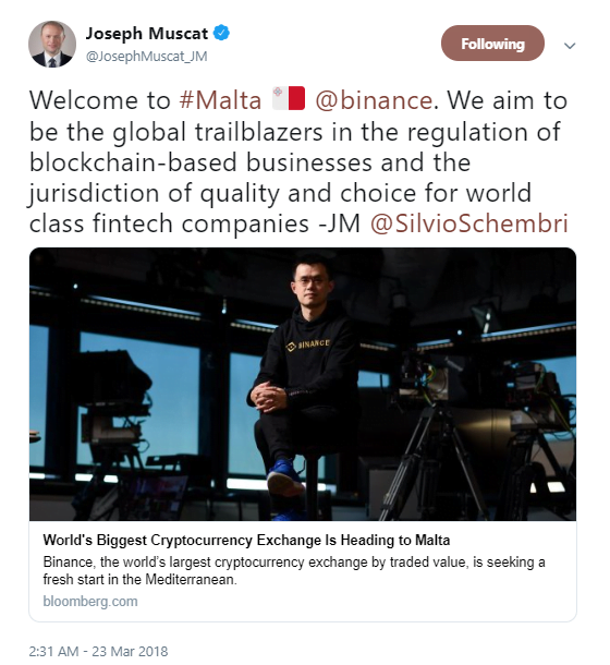 Binance said it was to set up shop in Malta in March 2018, and in October 2018, Malta passed its blockchain law that allowed crypto companies to apply for licences to operate from the country.
