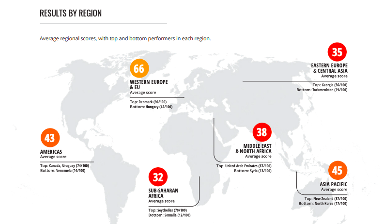 The index ranks 180 countries and territories by their perceived levels of public sector corruption according to 13 expert assessments. On the scale, 100 is very clean, and 0 is highly corrupt.