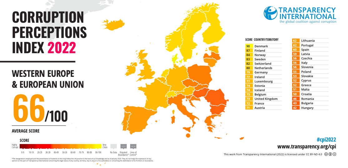 Only six of the 31 countries in the region have improved their scores, while seven have declined. The top scorers in 2022 were Denmark (CPI score: 90), Finland (87) and Norway (84).