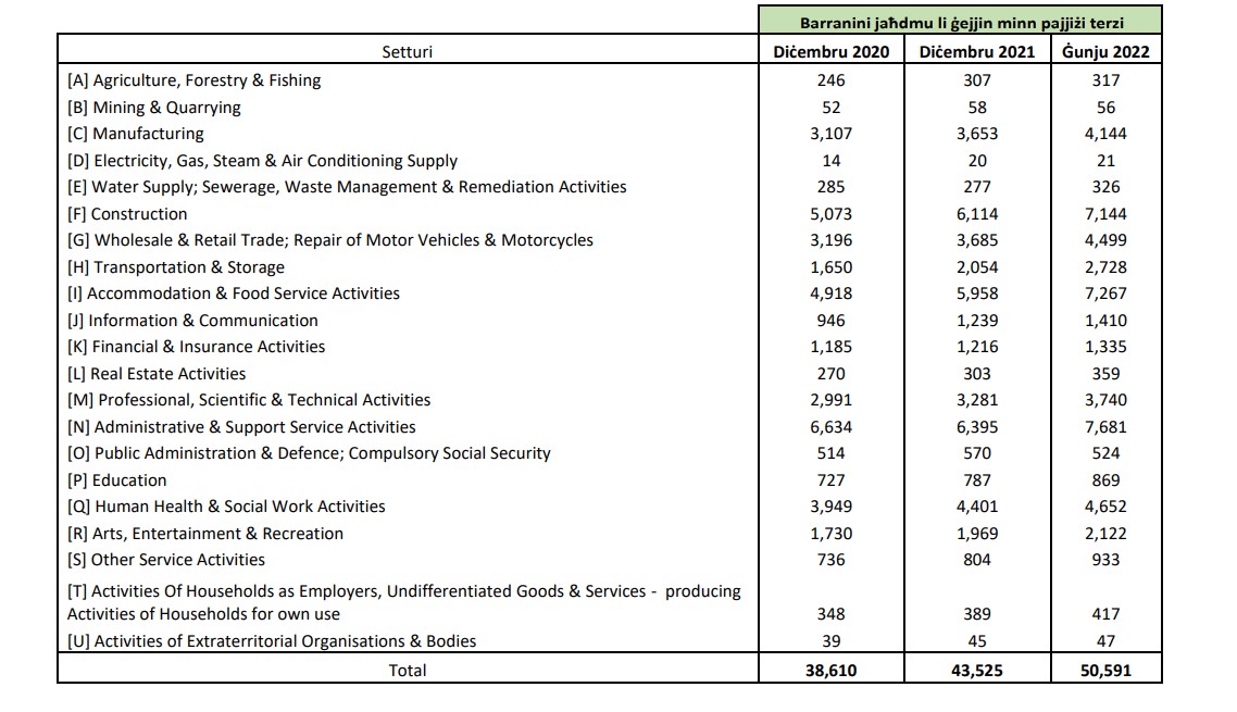 According to Caruana’s figures, by the end of 2021, the largest group of third-country nationals were employed in administrative and support service activities (6,395), construction (6,114) and accommodation and food services (5,958).