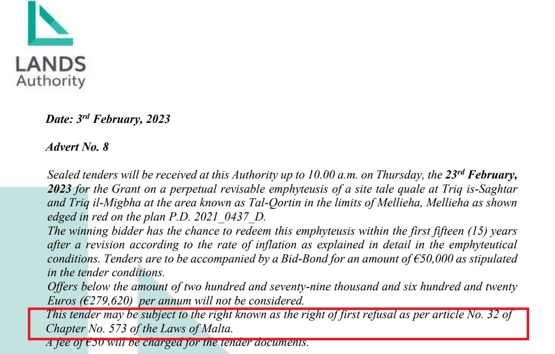 Investigations carried out by The Shift show that the almost 4,000 square metre site the Lands Authority is selling by tender includes a crucial clause stating that the plot “may be subject to the right known as the right of first refusal”.