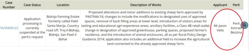 Although the name of the applicant behind the monstrosity on the PA’s website has been changed to Jason Vella, the original documentation for the latest structural changes at the farm still listed Bidnija Farming Enterprises Ltd as the applicant.