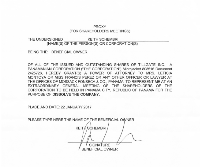 Documents from 2015 authorising the set-up of Tillgate Inc. show that Schembri signed off on the process, calling into question whether Schembri may have committed perjury in his PAC testimony. Schembri also chose to opt into options which allow for greater secrecy and lessened transparency when the company was opened.