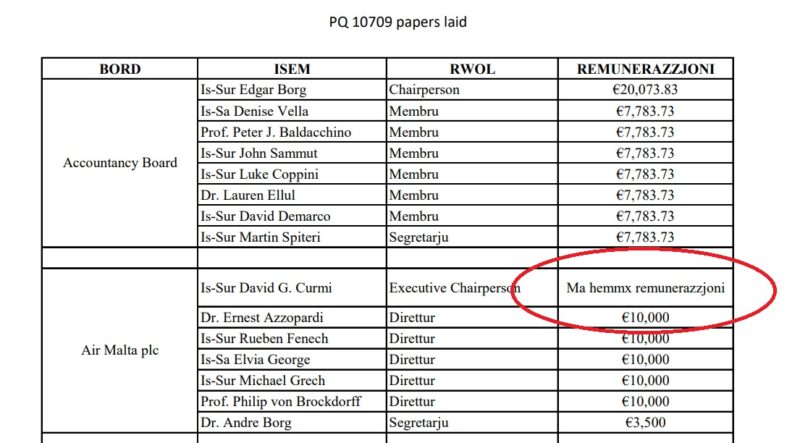 In response to questions over the composition of the boards falling under his remit and their respective salaries, Caruana presented a document stating that the Air Malta chairman “was not receiving any remuneration”.