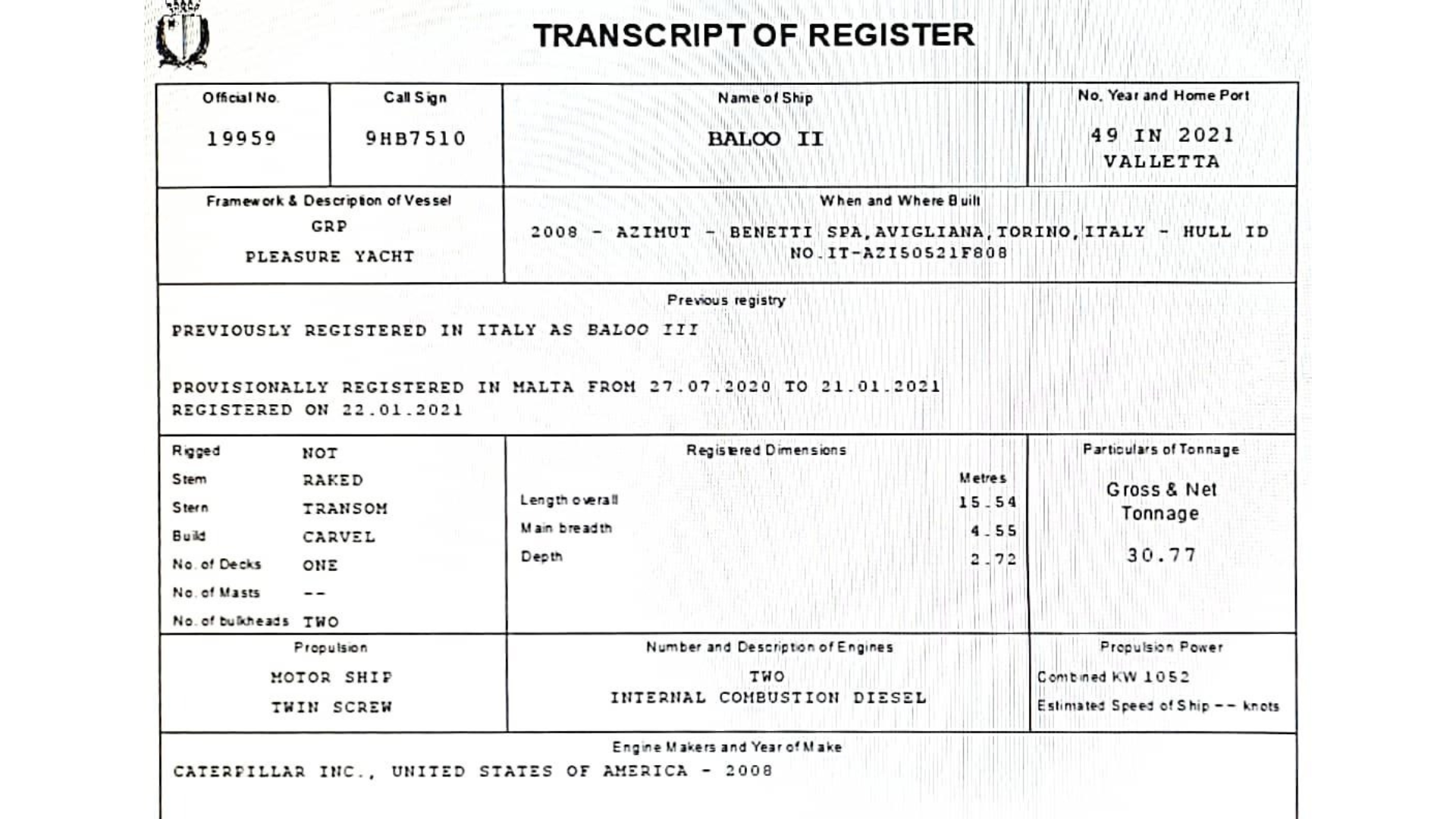 The Baloo III currently listed on the Malta Ship Registry is not Abela’s boat but a commercial charter yacht built by a different company.