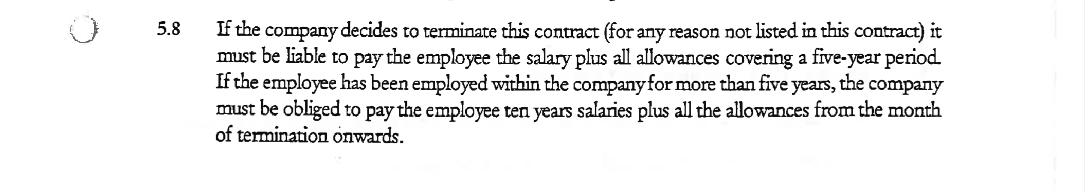 Moreover, it adds that “if the employee has been employed with the company for more than five years, the company must be obliged to pay the employee 10 years’ salaries plus all the allowances from the month of termination onwards.”