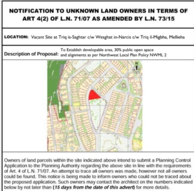 According to a legal notice, once the 15 days from this advert ends, Attard can ask the PA to proceed with his development application even on the part of the land that is not his.
